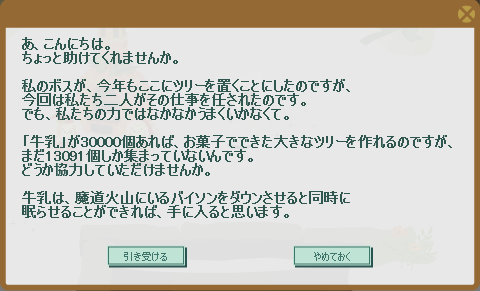 ガトーからツリーの材料である「牛乳」集めを依頼されます。