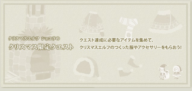 クリスマスエルフから頼まれたアイテムの入手方法が分からない場合は、クエストを受注した後でショコラに話しかけるとアドバイスしてくれますよ。