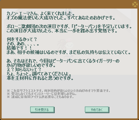 クエスト17:ピーターパンに出てくるタイガーリリーのかぶり物を納品