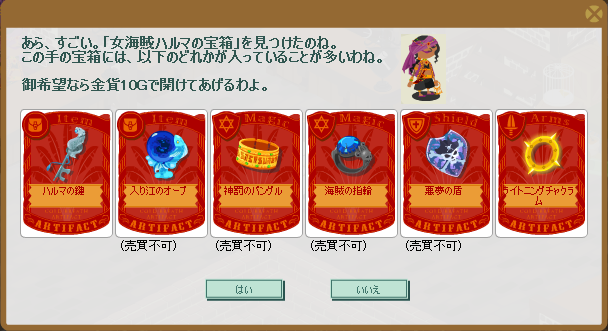 帰ってきた洞窟前で戦利品を確認すると、「女海賊ハルマの宝箱」をget☆していました。