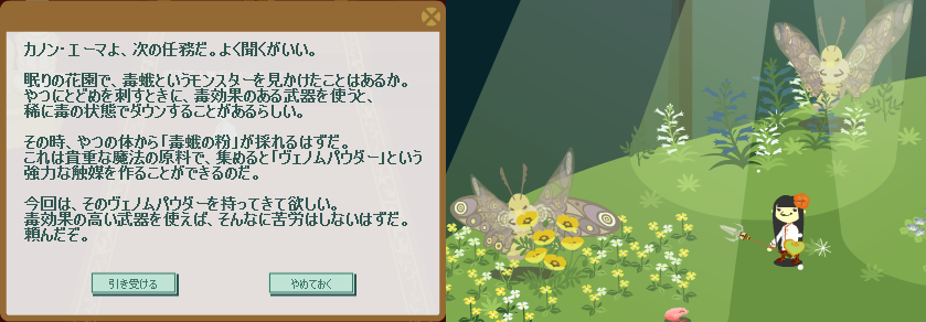 「粉」を採取する為には、毒蛾を「毒の状態でダウン」させる必要があります。