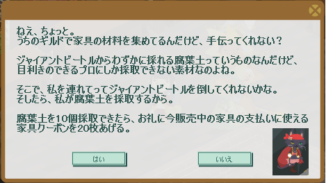 しかし、昨日から限定家具「ガーデニングシリーズ2」の販売が始まり、新たな家具クエスト「ジャイアントビートルの腐葉土編」が発注されました。