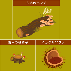 ちなみに、私は無難に「古木のベンチ」と「古木の株椅子」を選びました。