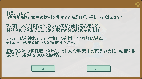 そして、家具ギルドからはクエスト「アポローンの幻のラム編」が発注されました。