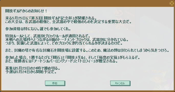 今日(5/23)は「第五回闘技ギルド記念杯」の募集〆切日です。