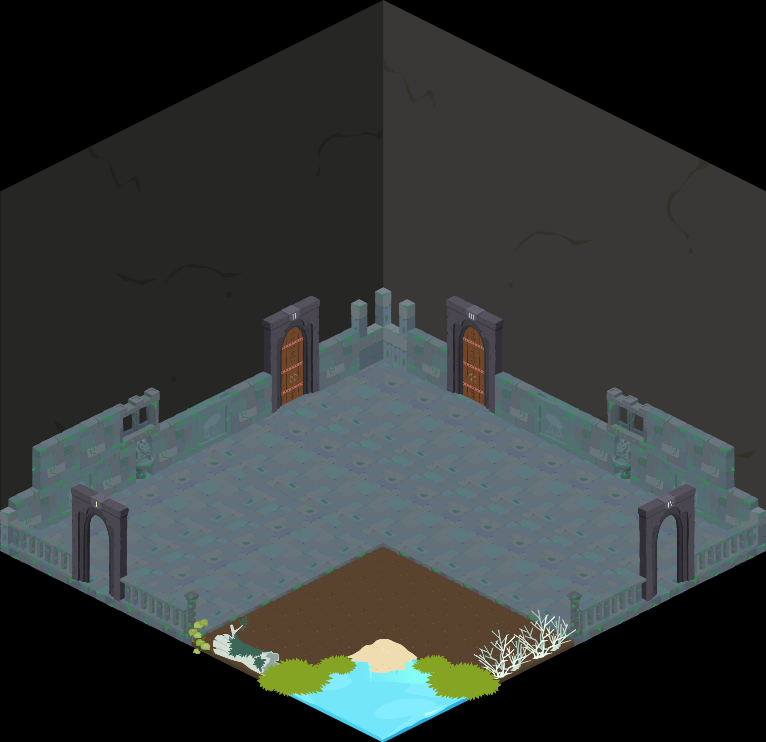 以上を踏まえて考えたアイデアが、「崩れかけの廃墟」と「月の光も星の明かりもない夜空」です。