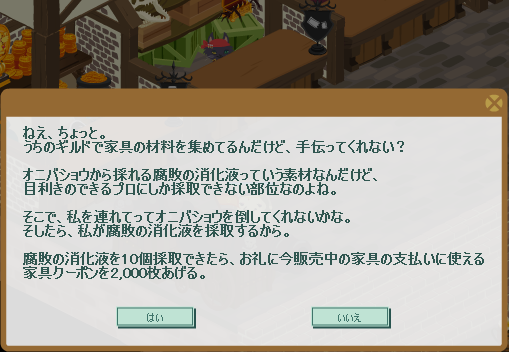 今週の家具クエストは「オニバショウの腐敗の消化液編」です。